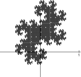 Die Menge aller durch Binärzahlen < 1 dargestellten komplexen Zahlen (also die Menge aller echten Brüche) bildet ein einfach zusammenhängendes Gebiet mit fraktalem Rand: den (gespiegelten) Zwillingsdrachen. Mit 2000 Punkten (2x2 Pixel) erhält man